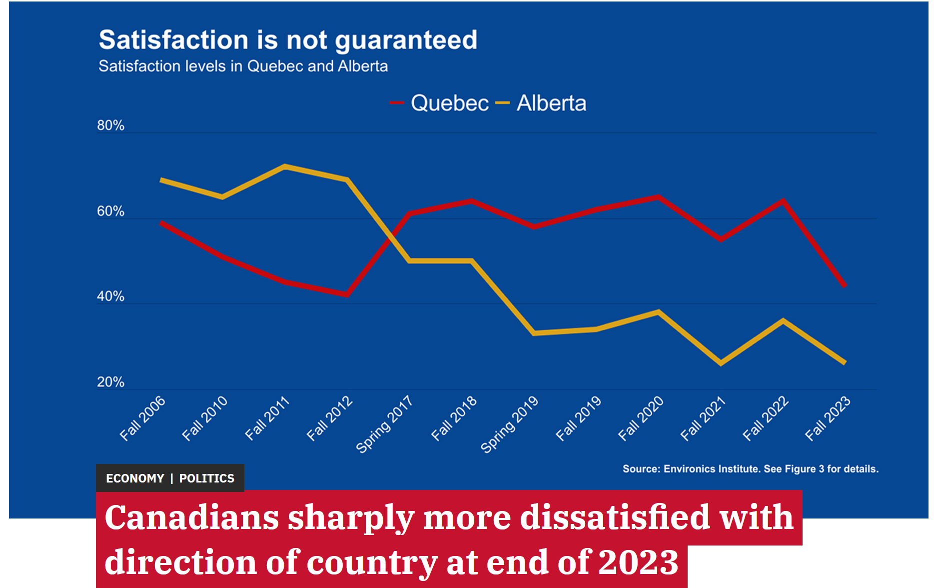 In a series of surveys over the past decade, the Environics Institute has asked Canadians a simple question: Overall, are you satisfied or dissatisfied with the way things are going in our country today?