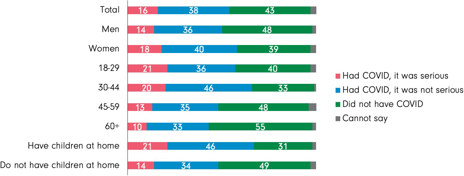 - 46% say they had not had COVID-19 (or say they don’t know);