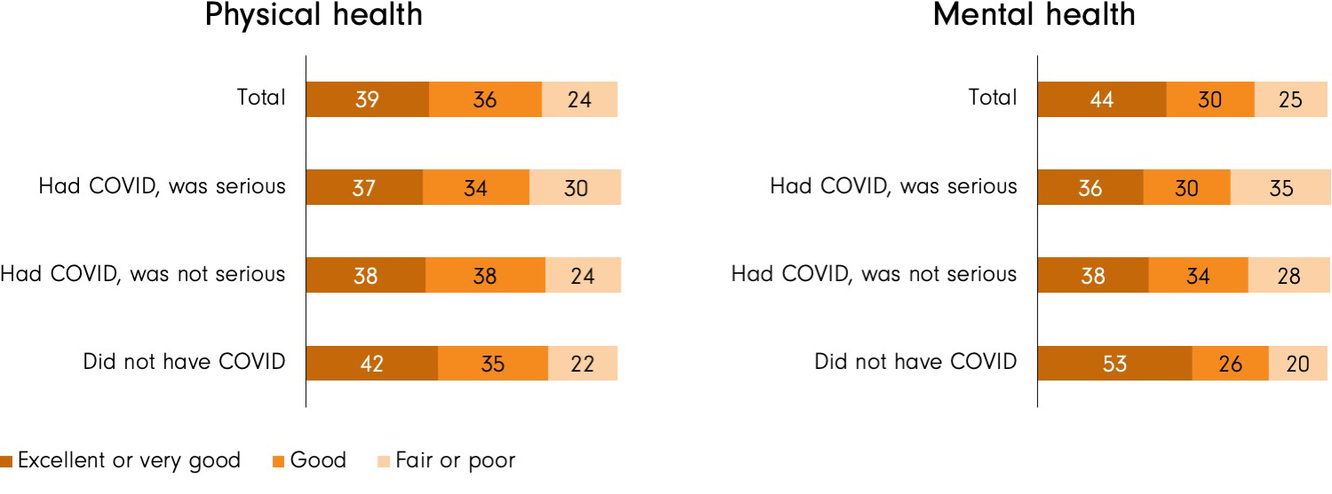 What’s more, the difference between those reporting having had a serious case of COVID-19 and those who do not report having had it at all is greater when it comes to the incidence of poor mental health (a difference of 15 percentage points in the proportion reporting fair or poor mental health) than to the incidence of poor physical health (a difference of 8 points).