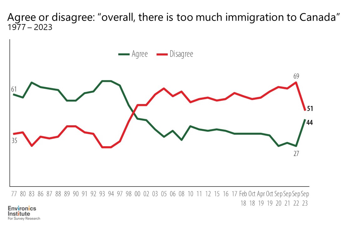 Canadians are now significantly more likely than a year ago to say there is too much immigration