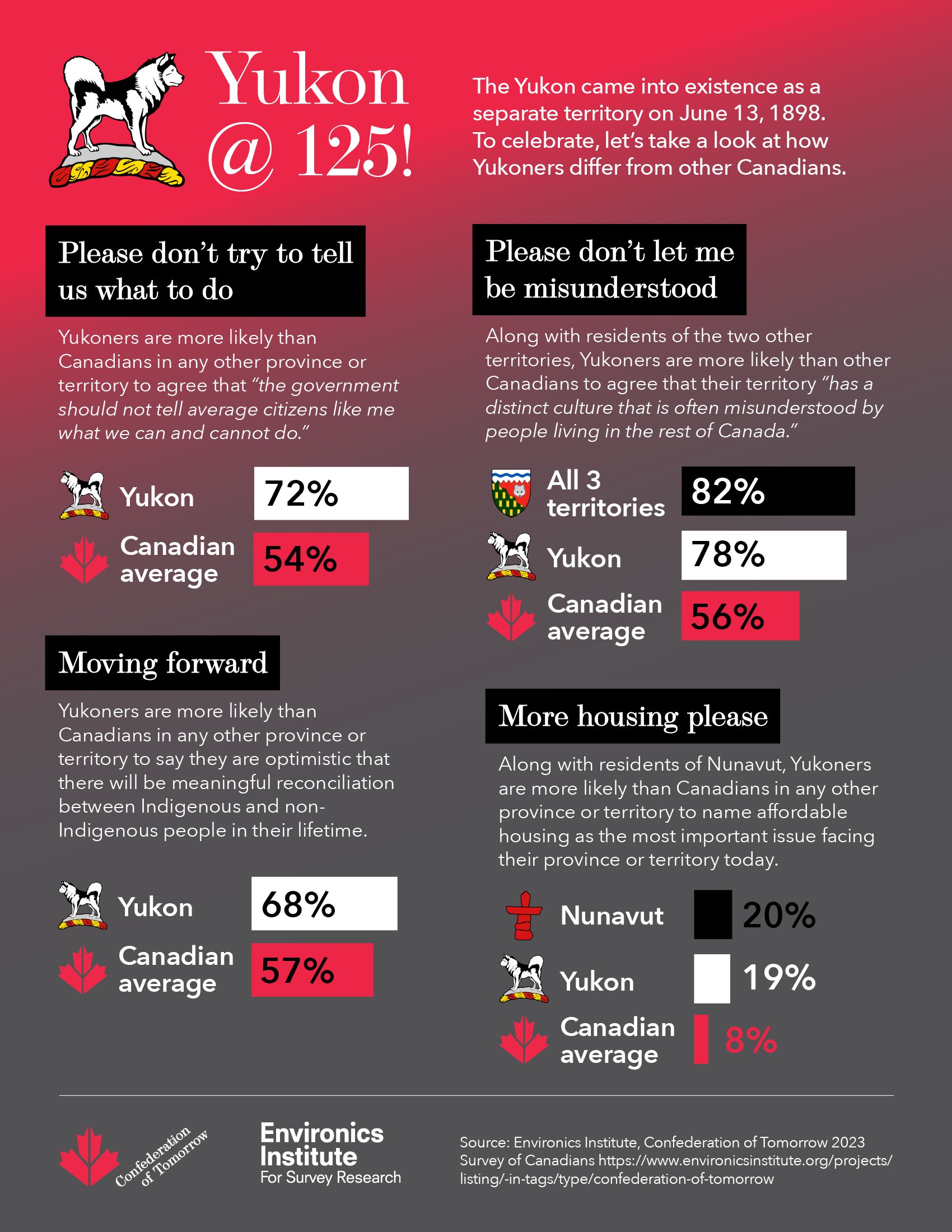 The Yukon came into existence as a separate territory on June 13, 1898. To mark the occasion, the Confederation of Tomorrow survey looks at how Yukoners’ opinions differ from those of other Canadians.
